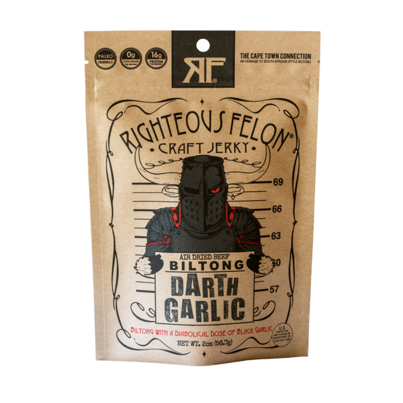 Righteous Felon Research & Development Program, this is your father. Or, well, actually, you're the father and this is the son. Whatever, you see what we're trying to do here. Darth Garlic is first graduate from the R&D initiative and represents version 2.0 of our R&D Black Garlic Biltong. The heavy dose of black garlic gives this amazingly tender meat snack a strong umami flavor. With 32g of protein, 0 grams of sugar, and <1g of carbs per bag, this biltong packs a punch for anyone looking to slim down in the new year without sacrificing on flavor.