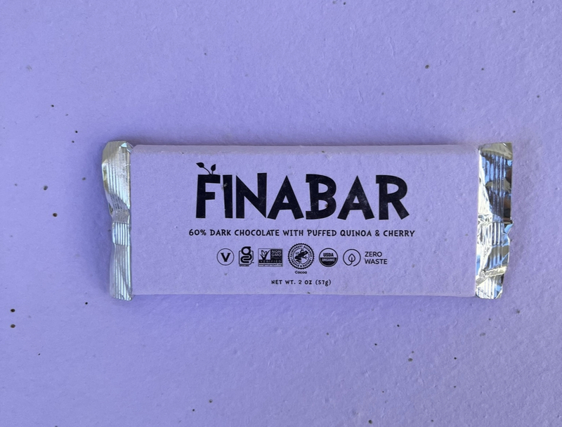 Vegan, gluten-free, non-gmo, rainforest alliance accredited, USDA organic, zero-waste, kosher 60% cocoa content dark chocolate with puffed quinoa and cherry. Fully biodegradable and compostable packaging, made from recycled materials in a factory powered by renewable energy.