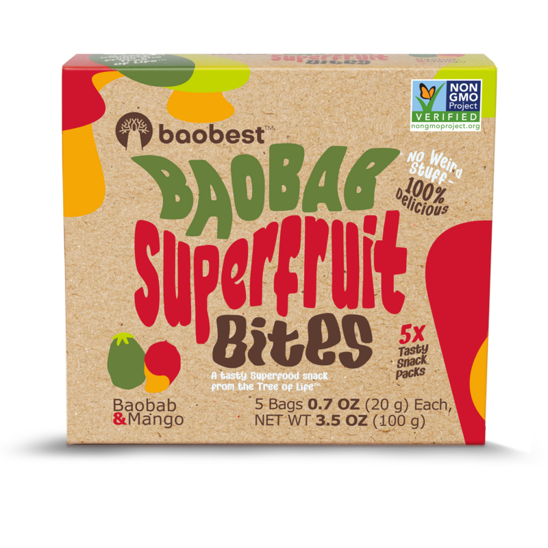 Baobab Superfruit Bites are a deliciously addictive fruit snacks, which feature no preservatives, no artificial colors or flavors, and no syrups, are the perfect snack for all ages and all activities; from school lunches, to a snack at work to weekend adventures. Each retail unit features 5 x 20g individual pouches, making them the perfect snack any occasion. Gluten-free, Vegan, Non-GMO and Kosher Certified.
