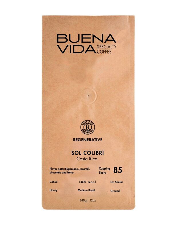 Buena Vida Specialty Coffee Sol Colibri Regenified Certified Ground 12 oz flavor notes of Sugarcane, Caramel, Chocolate and Fruity. SCA score 85
