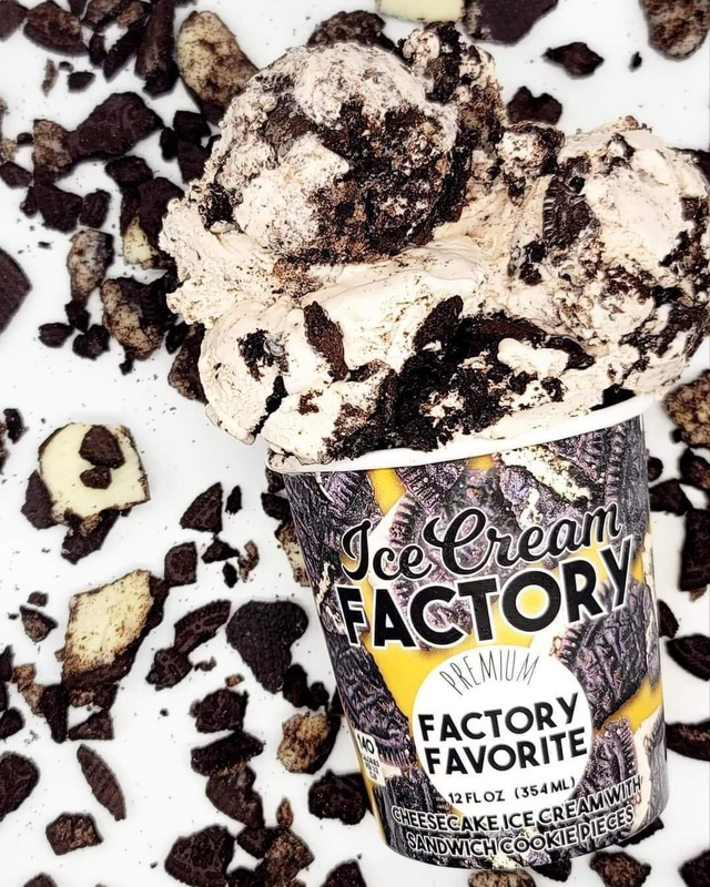 A cheesecake and chocolate cookie sandwich flavored ice cream with chopped sandwich cookies enveloped within this rich and creamy dessert..