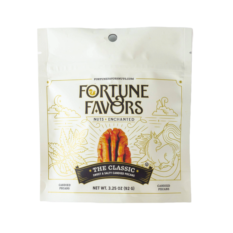 Fortune Favors The Classic Candied Pecans—the ultimate treat, snack and gift. An artful balance of sweet, salt, richness, crunch, and toastiness, presented in a stunning pouch that elevates snacking into an experience! Enjoy as a snack, an after-dinner treat, a salad topper, on a charcuterie board, a baking or finishing ingredient, a breakfast add-on, an energy boost after your workout, on your party or holiday table, or as a host/hostess gift.