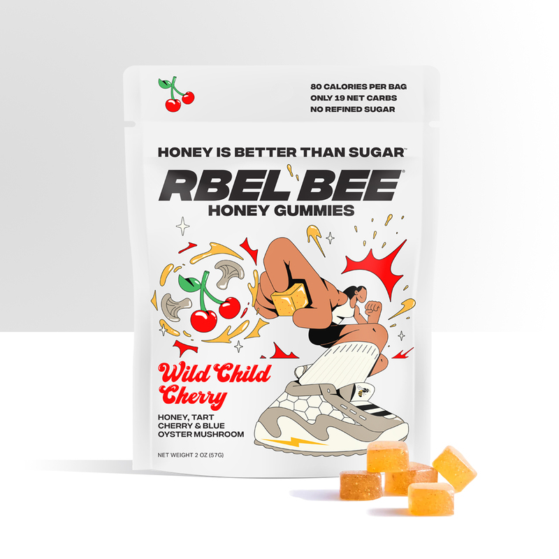 HONEY IS BETTER THAN SUGAR—it's our dominant ingredient. Rbel Bee gummies are sweetened with honey & paired with other functional foods—tart cherry & blue oyster mushrooms. We use no refined sugar, corn syrup or artificial colors or flavors. You can feel good about eating the whole bag!