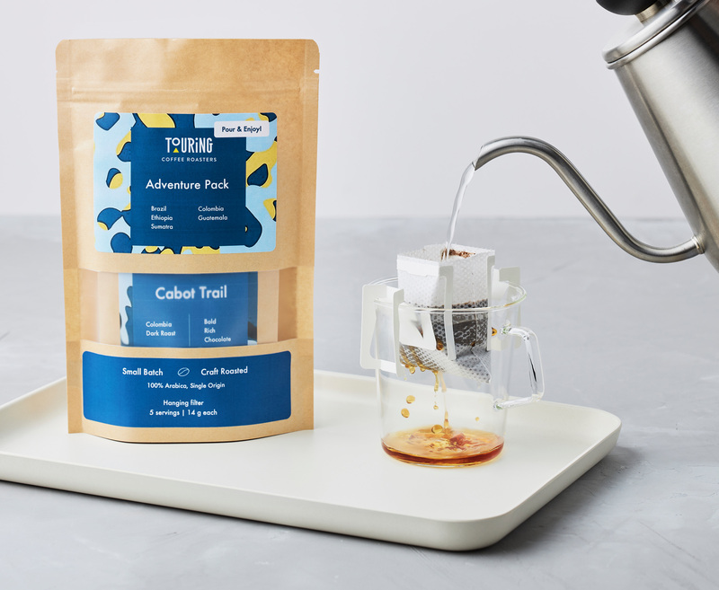 Tired of carrying coffee equipment when hiking or camping? Or when you are traveling and don't know where to find good coffee. Touring Coffee Roasters has the solution for you, introducing the Pour Over Pack. All you need is hot water and a cup for fresh, delicious specialty coffee in the palm of your hands. Perfect for any setting!