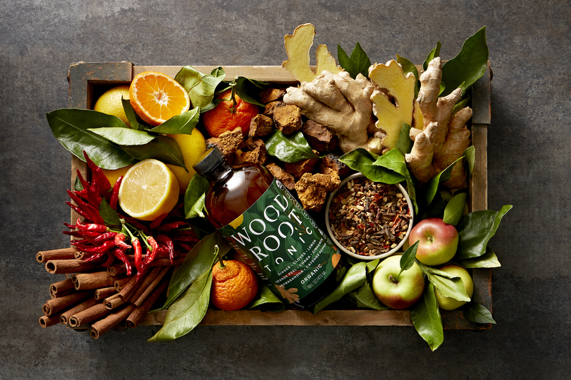 Organic apple cider vinegar, organic cinnamon, organic ginger, organic cloves, organic cayenne pepper, organic chaga mushroom, organic ashwagandha root, organic lemon peel, organic orange peel, organic lemon juice, and filtered water